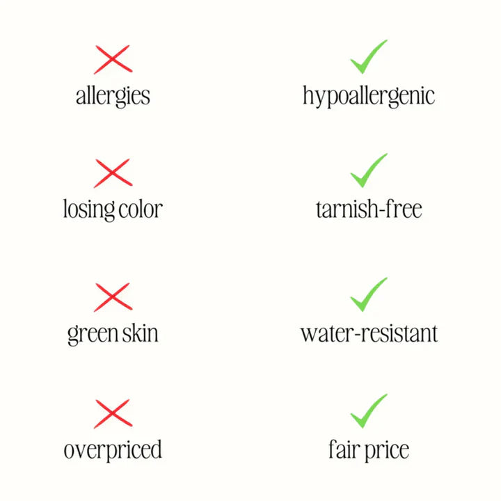 We use 316L stainless steel as the base and plate with 18k gold using PVD( Physical Vapor Deposition). This vacuum process bonds the color to the metal and is up to 10× thicker than standard gold plating, making it far more durable against daily wear, water, and sweat. You’re also covered by our Lifetime Color Guarantee— if color ever fades, we’ll make it right.